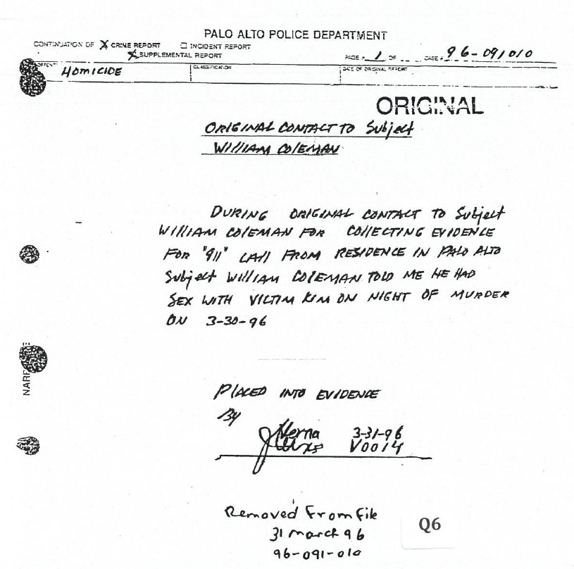 The document below is a confession given, the morning the body was discovered, to Palo Alto Police Officer J. Verna from William Coleman. This confessions puts Hak Joo Kim alive based on the events described by William Coleman; however, the DA Linda Condron presented to the jury that Peter Wilson had killed her between 12:58 - 1:48pm on 3-30-1996.